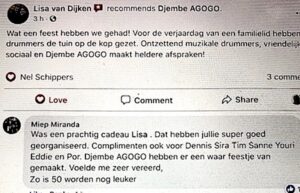 Bedankt voor jullie mooie optreden. Ik heb alleen maar complimenten gekregen over de Afrikaanse trommelaars, daar ben ik natuurlijk erg blij mee! Oke en zijn collega waren hun optreden dubbel en dwars waard, zoals je al had gezegd!